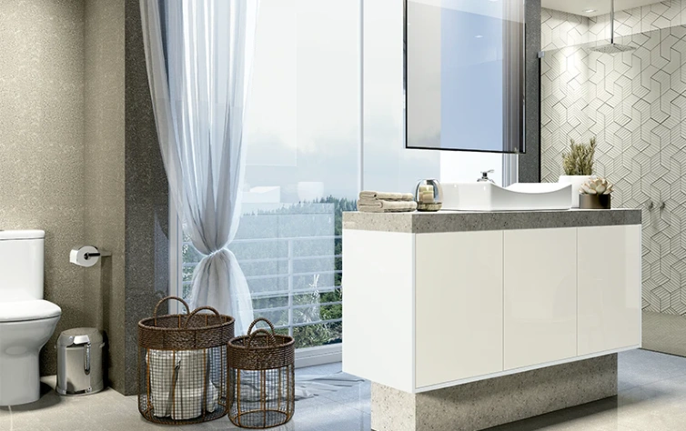 Um dica é apostar em cores claras nas paredes e no piso, para trazer amplitude e utilizando móveis com tamanhos e estilos adequados no ambiente. Você também pode apostar em algumas texturas, como o exemplo acima. Os móveis planejados da Italínea contam com divisões internas, prateleiras e nichos, que ajudam a manter o banheiro organizado.