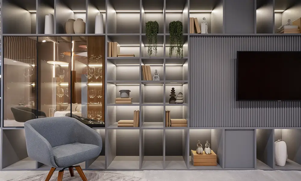 Quando integrada aos móveis planejados — como perfis embutidos, fitas internas ou LEDs aplicados em prateleiras —, a iluminação se torna parte do próprio desenho, facilitando o uso no dia a dia e garantindo uma percepção de cor mais fiel, funcional e sofisticada.