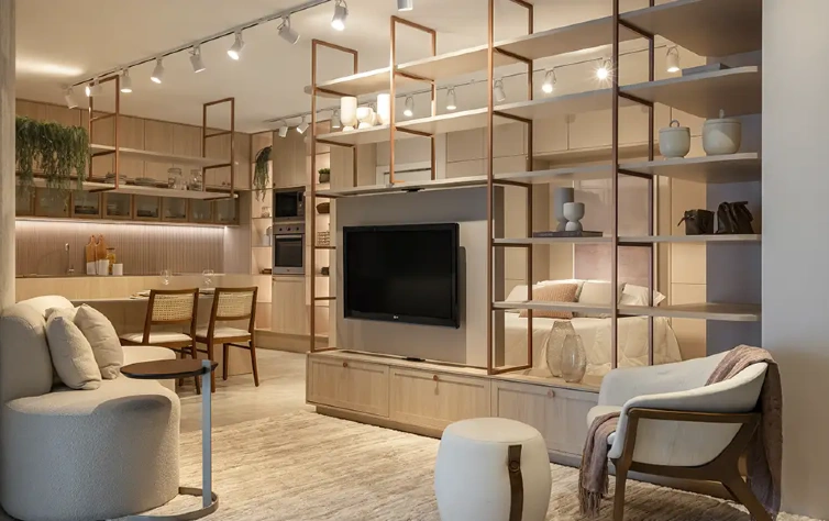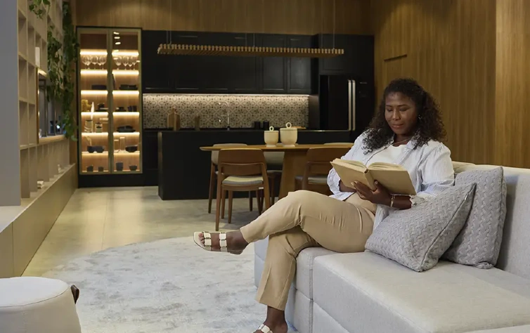 Esses recursos fazem da iluminação uma extensão do mobiliário, garantindo que cores, materiais e volumes sejam percebidos com fidelidade e beleza.
