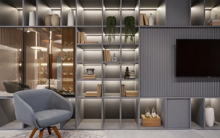 Essa variação influencia diretamente como percebemos o ambiente. Uma estante clara pode parecer sem volume com iluminação frontal intensa, enquanto uma luz posicionada de forma mais baixa destaca nichos, recortes e objetos decorativos de maneira muito mais natural. Da mesma forma, painéis lisos ficam mais elegantes quando iluminados de forma indireta, evitando reflexos excessivos que distorcem a cor.