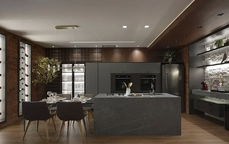 Na cozinha, a integração da luz aos módulos superiores e às áreas de apoio realça texturas de revestimentos e facilita o preparo dos alimentos, sem interferir na estética do ambiente. A iluminação se torna parte do desenho, reforçando linhas, proporções e a identidade dos materiais.